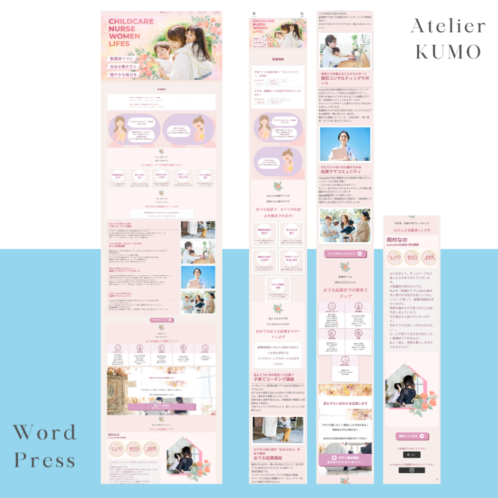 制作事例 2026.01.292026.03.16 ホームページ制作 ロゴ チラシ ホームページ制作 起業支援サイトWordPressで制作。薄ピンクと薄紫をキーカラーとした優しいデザインで、ママを応援する優しい気持ちと、子供に寄り添う大切さをイメージしてデザインしました。https://mamanursekigyououen.com/ 保育園サイトWordPressで制作。日々の投稿がしやすいよう、シンプルなデザインにすることで、保護者の皆さんへ安心を提供できるよう工夫しました。(デモサイトデザイン) 工務店サイトWordPressで制作。写真をメインにシンプルなデザインにすることで、視覚的な情報を提供できるよう工夫しました。(デモサイトデザイン) 幼稚園サイトWordPressで制作。イラストレーターで画像制作をし、個性的なデザインとなりました。日々の投稿がしやすいようシンプルなデザインにし、保護者の皆さんへ安心を提供できるよう工夫しました。(デモサイトデザイン) 保育園サイトcanvaで制作。こちらはサーバードメイン代(固定費)がかからず、無料でホームページを運用したい方におすすめです。(デモサイトデザイン) ロゴ 会社ロゴこちらはデモデザインです。 会社ロゴこちらはデモデザインです。 個人事業主ロゴこちらはスクール課題制作物です。 チラシ チラシ・ポスターポップで目を引くデザインを心がけました。(デモチラシ)